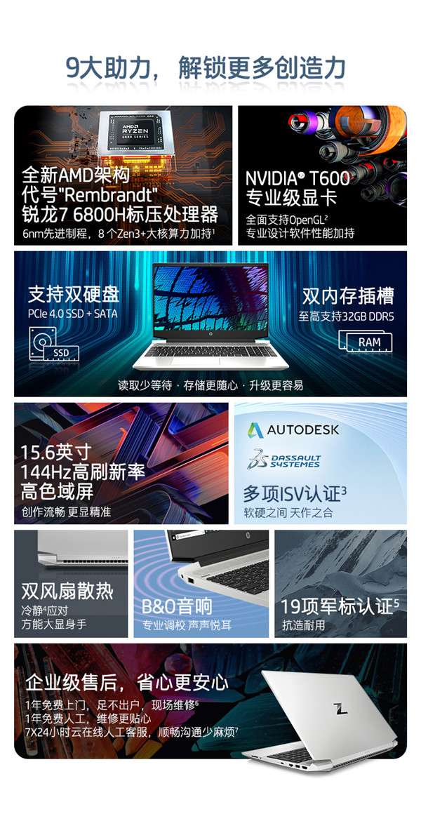 这款机型配备了英伟达 T600 专业显卡,全面支持 OpenGL 专业设计软件加速,通过 AUTODESK 等多项 ISV 认证,标配 16G 内存 + 512SSD+1T 机械硬盘,提供 PCe 4.0 SSD + SATA 硬盘位,至高支持 32GB DDR5 双通道内存。