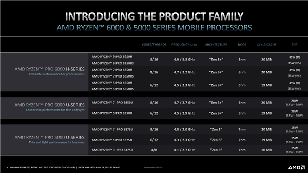 锐龙PRO 6000系列处理器面向商用商务市场,同样基于台积电6nm制造工艺、Zen3+ CPU架构、RDNA2 GPU架构,并特别内置微软Pluton安全处理器,支持AMD PRO管理性。