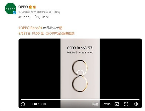 5月16日上午9点,OPPO手机官方微博正式官宣了OPPO Reno8系列机型,Slogan为“新Reno,[芯]朋友”,可能预示着系列机型将搭载全新骁龙芯片。