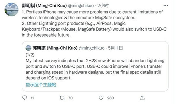 他认为,在可预见的未来,其他基于苹果 Lightning 接口的产品 (如 AirPods、Magic Keyboard / Trackpad / Mouse、MagSafe Battery) 也将改换为 USB-C 接口。