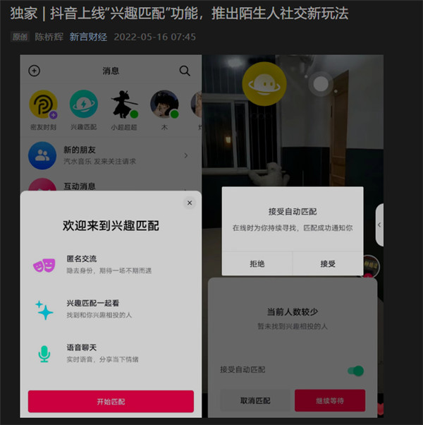 5 月 16 日消息,抖音 App 新增了一项“兴趣匹配”功能,但目前似乎仍处于测试中,只有部分用户才能看到。