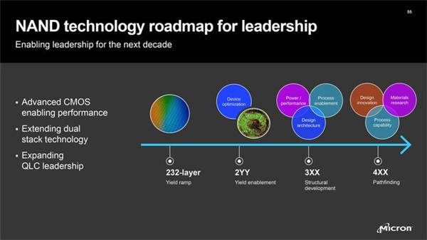 "DeBoer说:"我们围绕制造世界上最快的管理型NAND以及数据中心和客户SSD产品所需要的东西,优化了[232层3D NAND]技术。"控制器的组合,包括内部和外部的控制器,一直是我们垂直产品整合重点的一个强有力的元素,以确保我们对NAND和控制器技术进行了优化,以满足我们提供未来领导产品的需要"。
