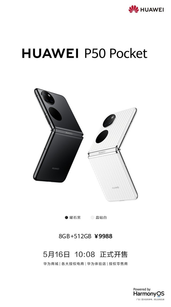 5月16日上午10:08,华为P50 Pocket 8GB+512GB版本将正式开售,包含曜石黑、晶钻白两种配色,售价9988元,升级大内存版本,容纳更多记忆与灵感。