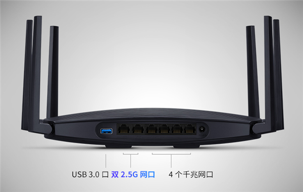 接口方面,路由器采用双2.5G网口,可用来接入高速宽带,也具备2.5G内网共享的能力,同时还有4个千兆网卡和1个USB 3.0接口。