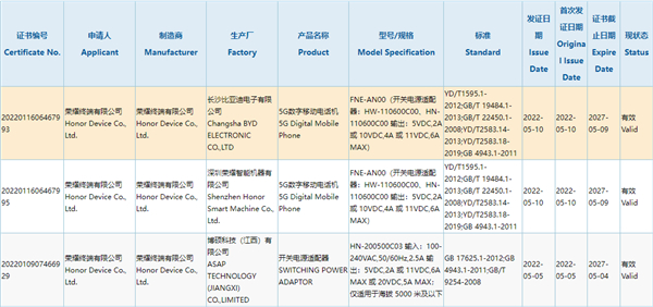 从入网信息可以看出,荣耀新机将支持最高11VDC×6A的快充规格,即66W快充适配器,将有荣耀自家工厂与长沙比亚迪共同制造。