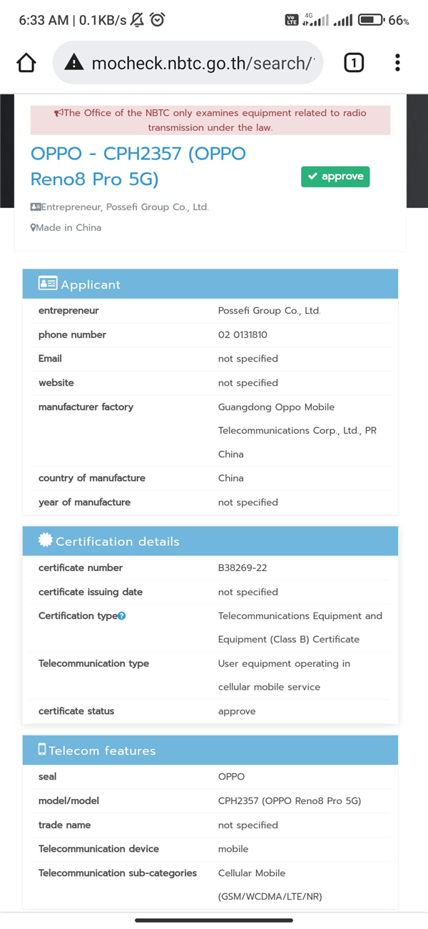 5月11日消息,OPPO Reno8 Pro(型号为CPH2357)获得NBTC认证,该机将于本月正式发布。