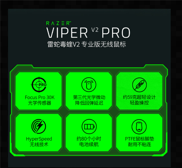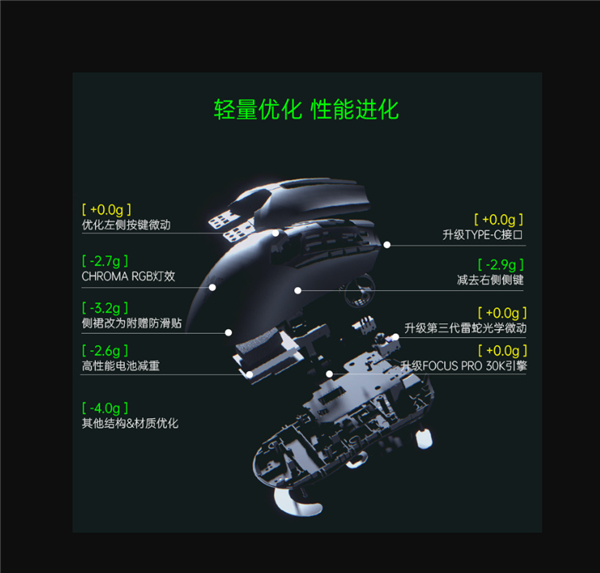 核心配置方面,毒蝰V2专业版搭载全新定制Focus Pro 30K光学传感器,最高可达30000 DPI、750 IPS和承受70G加速度,左右按键为第三代定制光学微动开关,标称9000万次点击寿命。