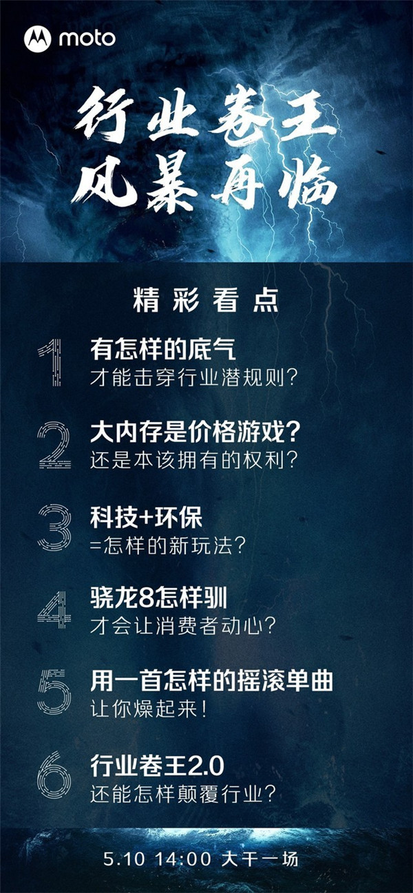 5月10日下午,摩托罗拉将正式举行“大干一场”摇滚发布会,发布又一新款行业卷王。前代“卷王”moto edge S30冠军版用512GB大内存2499元的价格将手机存储带入了“5元/GB新时代”,不知道本次,摩托罗拉还会为用户们带来什么惊喜。
