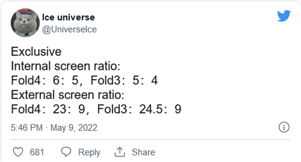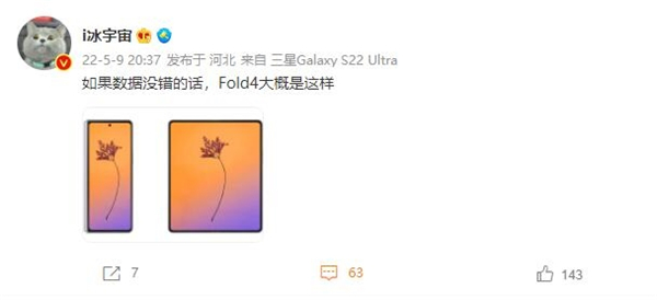 数码博主@i冰宇宙 今日曝光了Galaxy Z Fold4的外观。根据曝料,Galaxy Z Fold4和上一代一样是内外双屏设计,外屏比例为23:9,内屏比例为6:5,将会有米色、黑色和灰色这几款配色可选。