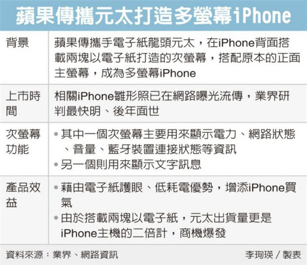 据悉,苹果携手电子纸龙头元太,在iPhone背面搭载两块以电子纸打造的次屏幕,搭配原本的正面主屏幕,成为多屏幕iPhone,拥有电子纸护眼、低耗电优势,为iPhone再添一丝购买理由。