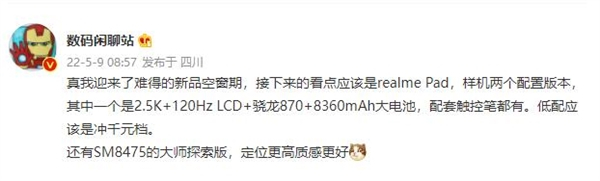 新款realme Pad还将搭配触控笔,预计将冲击千元档位。该博主还爆料该机将会有高通SM8475(骁龙8 Gen1 Plus)的大师探索版可选。据悉,骁龙8 Gen1 Plus有着不错的性能表现,总体性能较上一代将提升10%左右。
