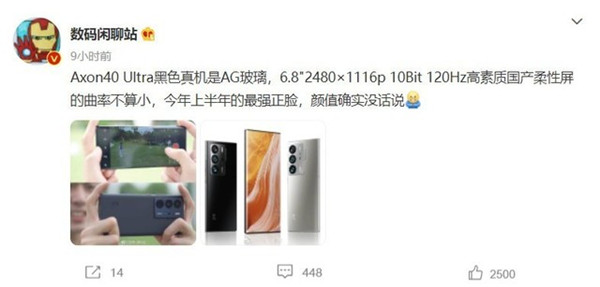 昨日,数码博主 @数码闲聊站 曝光了易主中兴 Axon 40 Ultra黑色真机上手图,并且称中兴 Axon 40 Ultra黑色真机的背面是AG玻璃,正面则为6.8英寸的10Bit 120Hz高素质国产柔性屏,其分辨率为2480×1116,而且其正面屏幕的曲率很大。