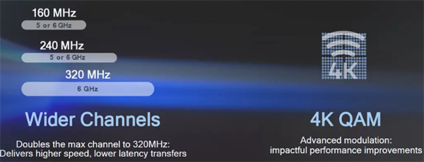 ● 支持最高 320MHz 的信道宽度(可在2.4GHz、5GHz和6GHz频段运行)