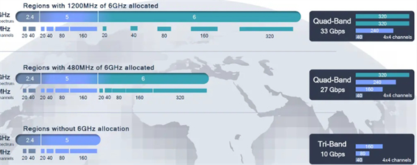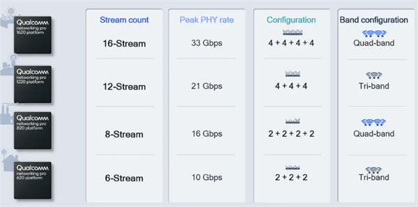高通公司声称,峰值系统PHY速率高达33Gbps,每个信道的无线 PHY 速率超过10Gbps,每个信道能够支持 500 多个用户。用于Wi-Fi的6GHz频谱的可用性并不普遍。高通公司表示,根据分配情况,Networking Pro第三代系列的不同配置是可能的。