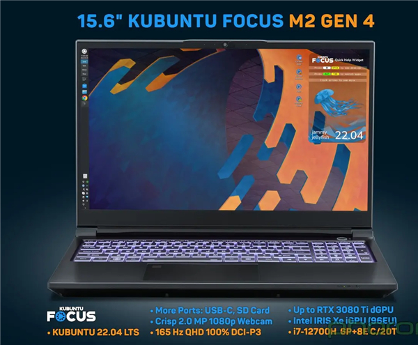 Kubuntu Focus M2 Gen4 笔记本电脑采用英特尔 Alder Lake 处理器,最高支持选配英特尔酷睿 i7-12700H 处理器,和最高 NVIDIA RTX 3080 Ti 移动 GPU。