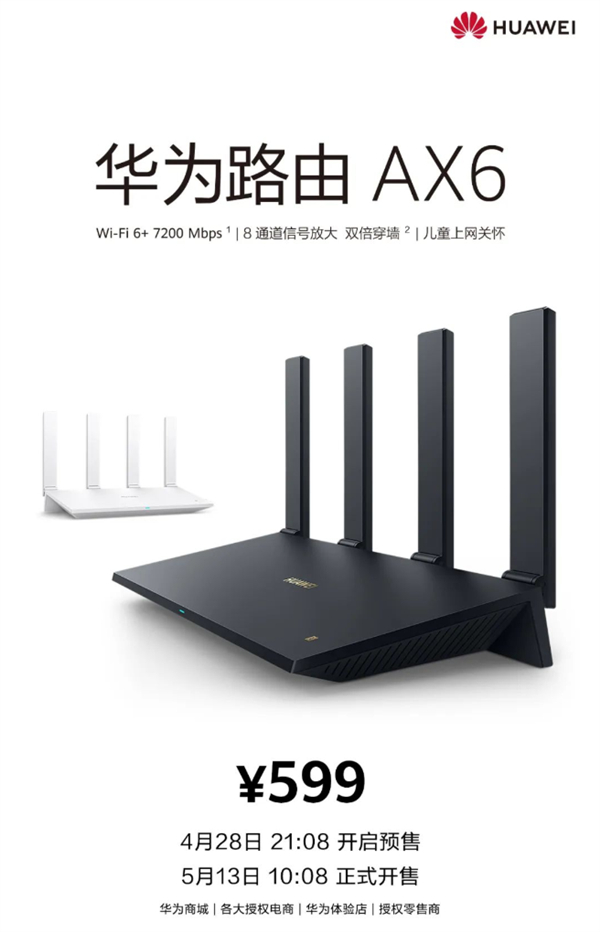 4月28日晚,华为推出了首款HarmonyOS智慧路由——华为路由AX6,售价599元,现已开启预售,将于5月13日10:08正式开售,首发到手价549元。