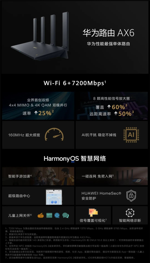 华为路由AX6无线组合速率可达7200Mbps,其中2.4GHz频段速率达1376Mbps,5GHz频段速率达5765Mbps,都远高于传统AX3000路由器。