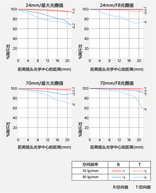 镜头直径为88mm,长120mm,使用82mm螺纹滤镜,镜筒上除了对焦环、变焦环、AF/MF开关外,还有带有光圈环、光圈锁定开关、无极光圈点按开关、变焦平滑度调节器以及两个对焦锁定按键,而且所有按键、开关均配备橡胶垫,提升了防尘防潮性能,前镜片还是用氟镀膜,能够减少镜片表面沾染灰尘、油污。从官方MTF看上,FE 24-70mm F2.8 GM II更倾向优化70mm端的画质,70mm端在全开光圈时拥有更佳的曲线。