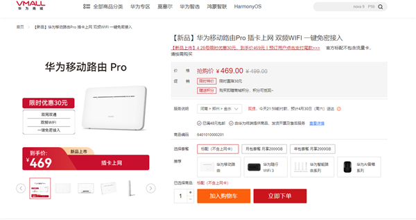 4月28日消息,前不久,华为发布移动路由Pro,提供标配版(不含上网卡)、月包套餐版、年包套餐版三款配置,经过多日预售,新品于今日正式开售,售价分别为499元、598元和1098元。