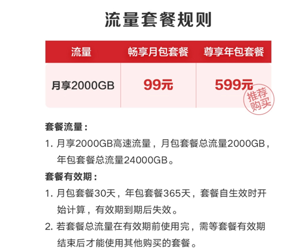 流量方面,套餐月享2000GB高速流量,月包套餐总流量为2000GB、年包套餐总流量为24000GB。