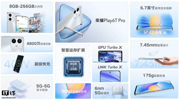荣耀 Play6T Pro 搭载联发科天玑 810 芯片,采用 6.7 英寸 LCD 屏,90Hz 刷新率,2388×1080 分辨率;采用 8MP 前置镜头,后置 48MP+2MP 双摄;内置 4000mAh 电池,支持 40W 快充,20 分钟充电 50%。