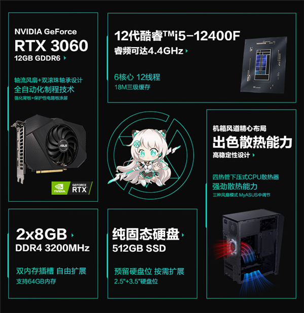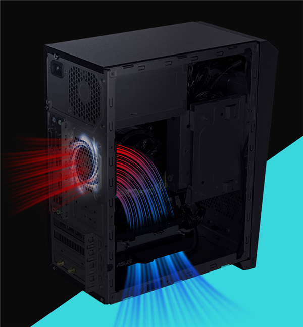 同时还配有2根8GB DDR4 3200MHz内存,以及512GB固态硬盘,预留硬盘位。四热管下压式CPU散热器,强劲散热,三种风扇模式MyASUS中调节。