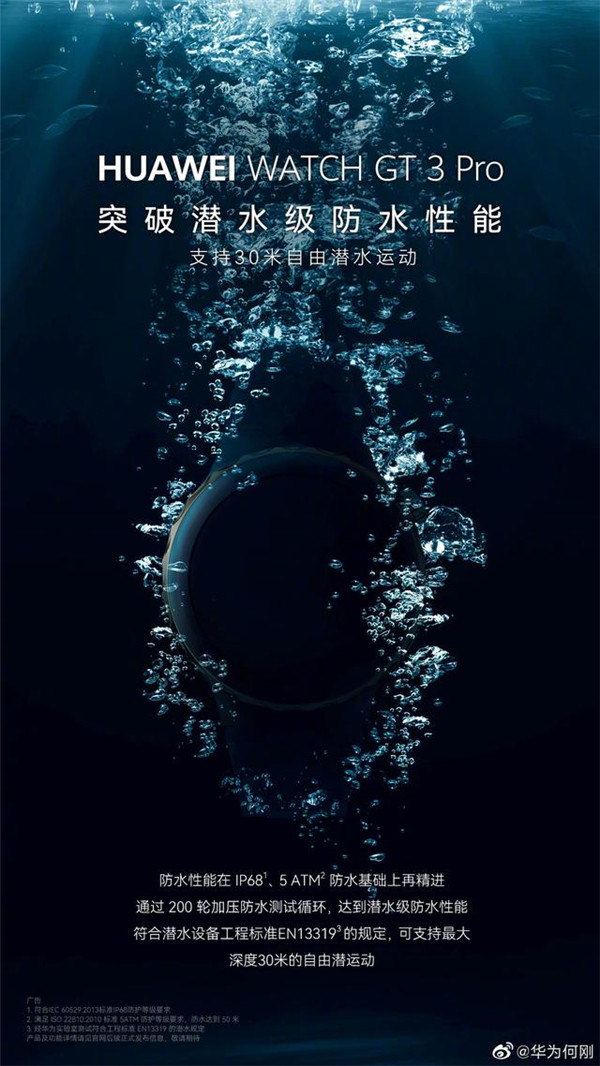 华为终端 BG 首席运营官何刚称,华为 Watch GT 3 Pro 是其首款支持自由潜水功能的智能手表,新表防水性能在 IP68、5 ATM 的基础上再次精进,通过 200 轮加压防水测试循环,实现潜水级防水性能重要突破,符合潜水设备工程标准 EN13319 的规定,可支持在海洋中最大深度 30 米的自由潜运动。