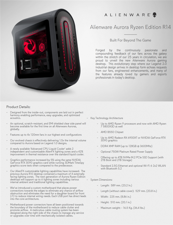 首先介绍 Alienware Aurora Ryzen Edition R14,该游戏 PC 可选锐龙 R9 和 R7-5800X3D 处理器(一体式水冷),主板为 B550 芯片组。