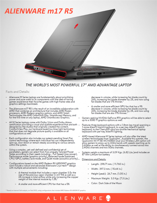 然后是 Alienware m17 R5 / m15 R7 发烧游戏本,其配备了 AMD 锐龙 6000 系列 APU 。
