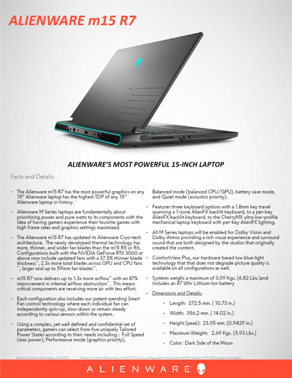 ● Alienware m15 R7:起价 1499.99 美元(约 9711 RMB)。