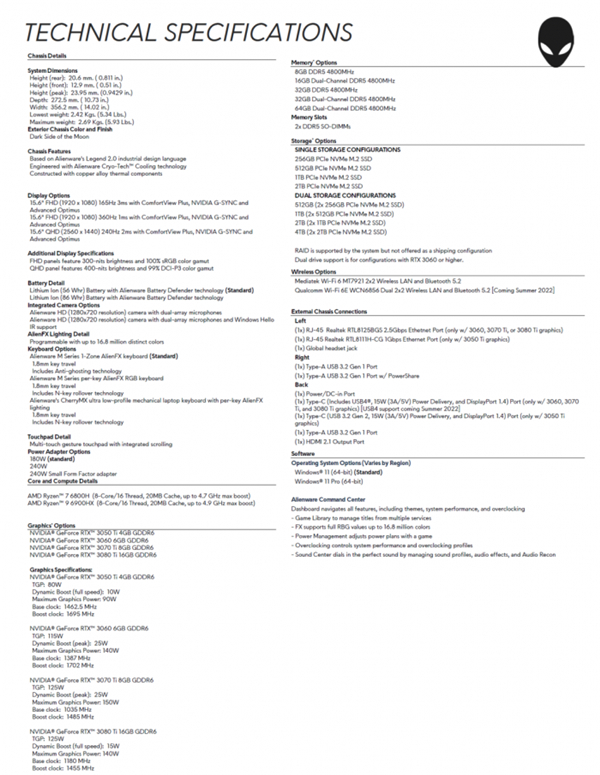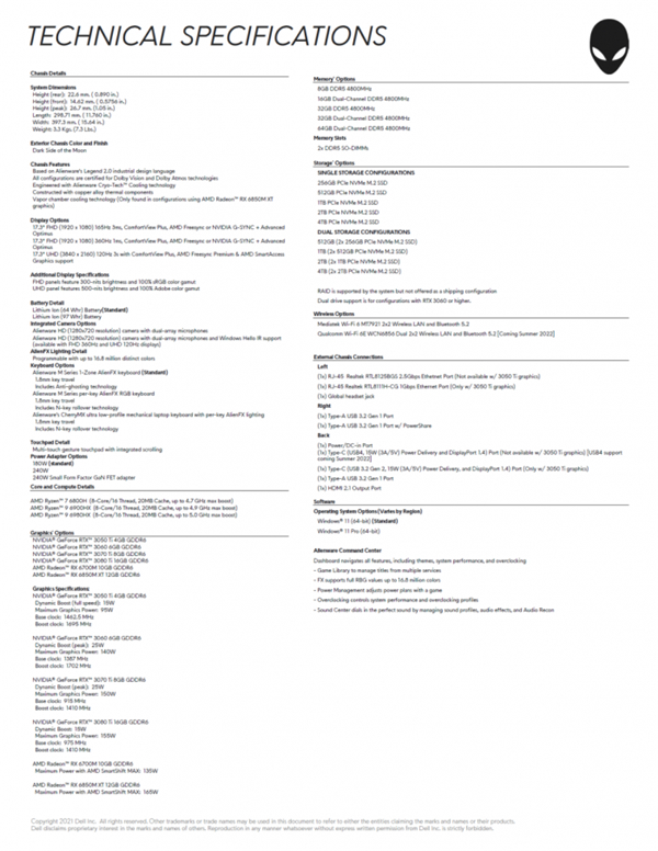 存储最高支持 64GB 双通道 DDR5-4800 内存 + 4TB PCIe NVMe SSD,显卡可选 Radeon RX 6850M XT(12GB 显存 / 175W 功耗)或 GeForce RTX 3080 Ti(16GB 显存 / 180W 功耗)。