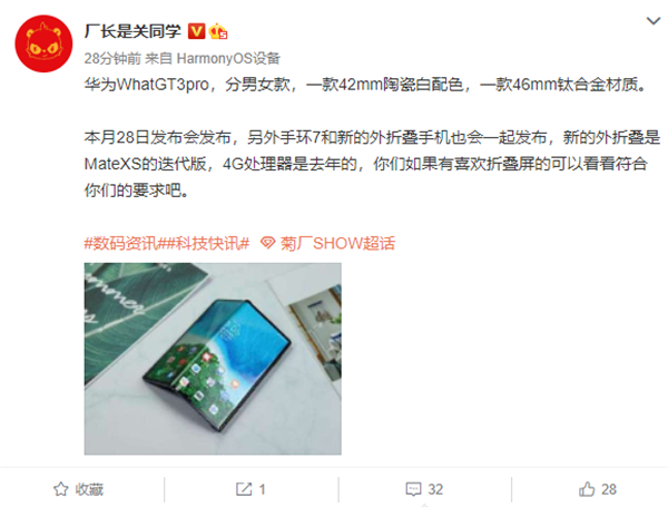 今早,@华为终端官方微博 发文宣布,将于4月28日晚19:00召开“华为折叠屏及全场景新品发布会”,届时将正式推出华为Mate Xs 2。