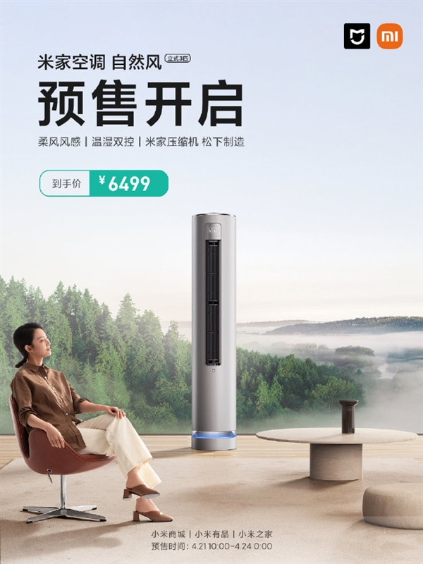4月21日,米家空调 自然风立式3匹(变频/新一级),现已上架预售,订金100抵300元,到手价6499元,6年质保。