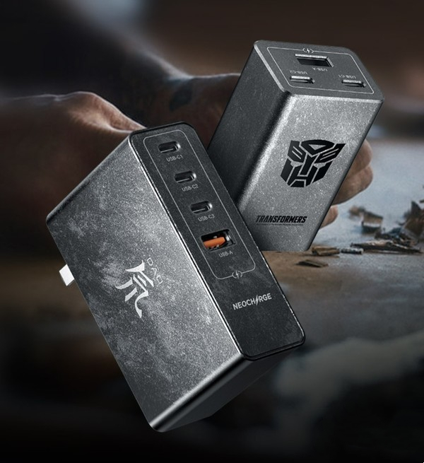 根据官方的图片我们可以看到,这两款充电器都采用了银灰配色,充满了金属的气息,插头采用了可折叠的设计,更加方便用户携带。与变形金刚联名后,这两款产品在表面还有变形金刚的纹案装饰。