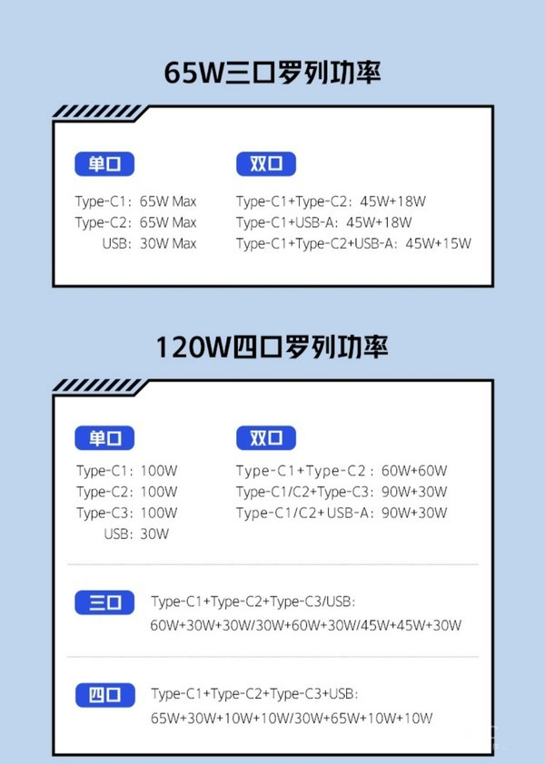 官方信息显示,65W型号拥有两个C口和一个A口,双C口均支持最大65W的充电功率。而120W型号拥有四个充电接口,分别为一个A口和三个C口,其中三个C口均支持最大100W的充电功率,三口同时输出最高功率可达120W。“盲插”也算是这两款充电器的卖点之一,有相关需求的用户可以关注一下。