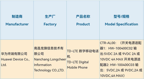 相关信息显示,这款通过了3C认证的华为手机支持4G网络,制造厂商为华为终端有限公司,生产厂商为南昌龙旗信息技术有限公司。关于这款产品的具体配置信息,暂时还没有透露出来,不过我们可以了解到,这款手机最高支持40W的充电功率,同时随机配备40W的充电头。