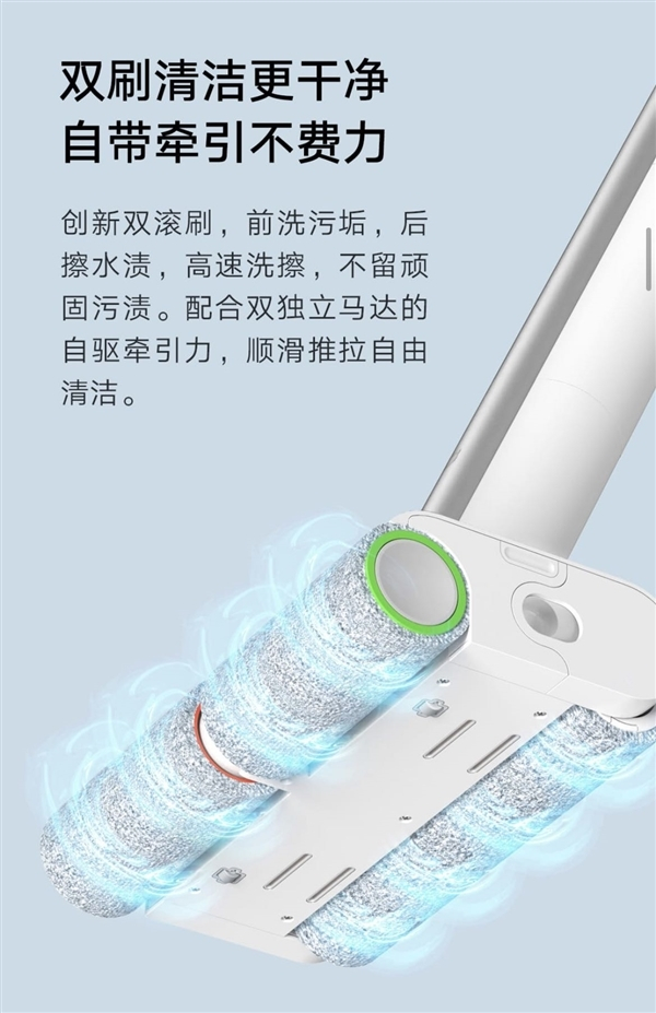 米家双刷无线拖地机采用创新双滚刷设计,前洗污垢,后擦水渍,实现前拖后擦,双倍洁净一机搞定,提高用户的清洁效率,并拥有35分钟长续航。