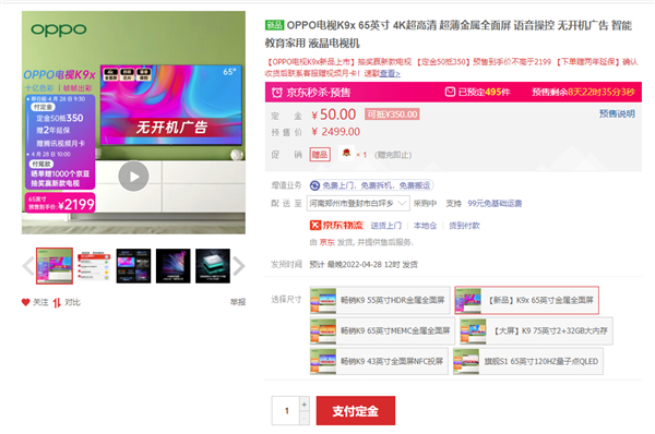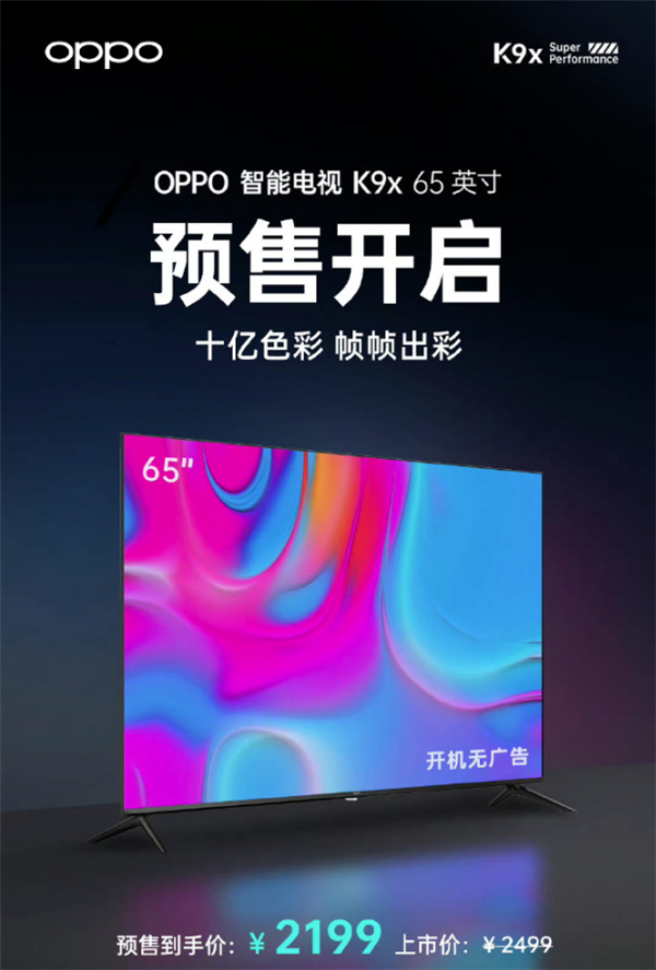 根据OPPO助理副总裁、OPPO IoT事业群负责人@李开新 介绍,OPPO智能电视K9x 65英寸版已经开始预售,原价2499元,预售到手价仅需2199元(点击购买)。