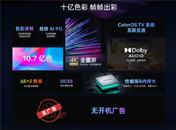 配置方面,OPPO K9x智能电视采用一块65英寸LCD 4K屏,分辨率为3840*2160,刷新率为60Hz,拥有10亿色彩、70% NTSC色域,280nit亮度,delta E≈2。