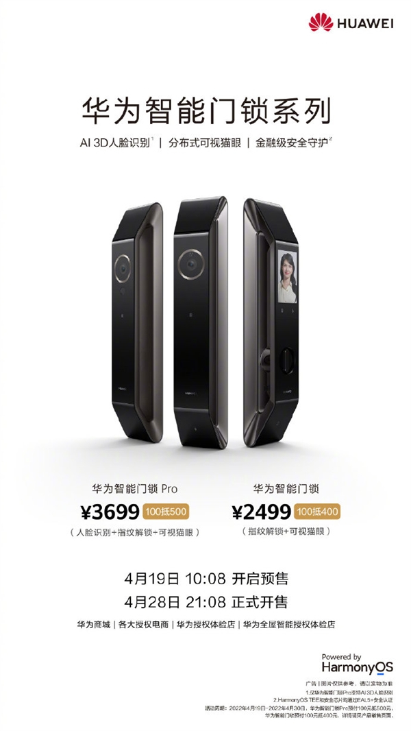 今天,这款门锁开启预售,华为智能门锁售价2499元(100抵400),华为智能门锁Pro售价3699元(100抵500),将于4月28日首销。