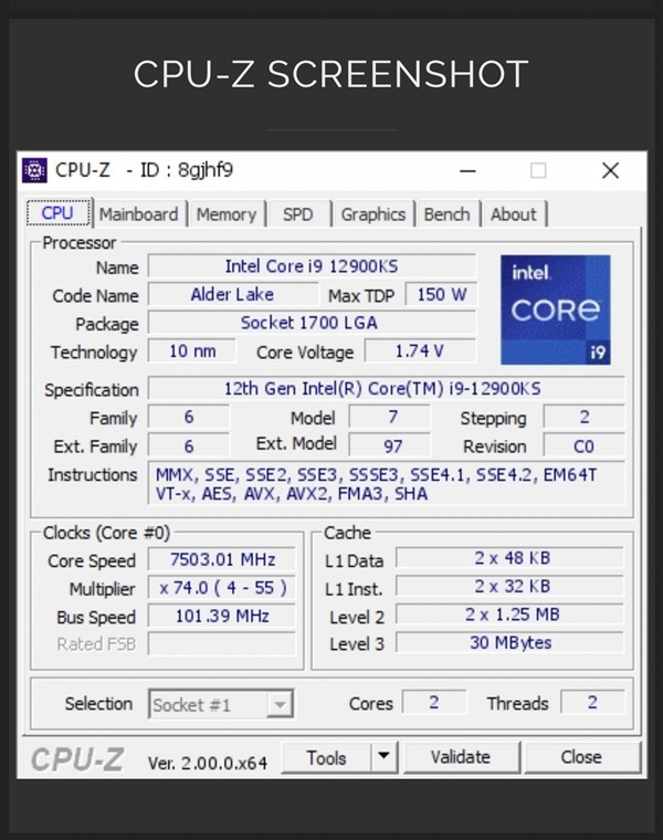 此次超频的主板为微星MEG Z690 UNIFY-X暗影,CPU的外频已经拉升到101.39MHz,倍频也有74x,最终突破7.5GHz。CPU超频环境电压达到了1.74V,在只开启了两个大核心的情况下关掉超线程,最终达到了这样的成绩。