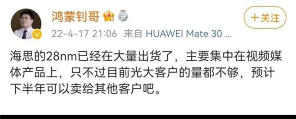 4 月 18 日消息,据微博博主 @鸿蒙钊哥 称,“华为海思的 28nm 已经在大量出货了,主要集中在视频媒体产品上,只不过目前光大客户的量都不够,预计下半年可以卖给其他客户。”