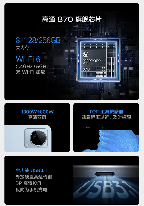影像方面,vivo Pad后置主摄规格为1300万像素主摄+800万像素超广角镜头,其中主摄支持4K 30fps及1080p 60fps拍摄,前置则是800万像素镜头。