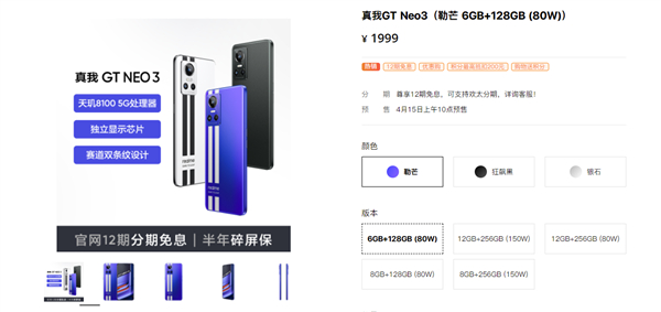 根据官方消息,️realme GT Neo3 6GB版将于今天上午10点钟正式开启预售,4月18日上午10点正式发售,售价1999元(官网独家)。