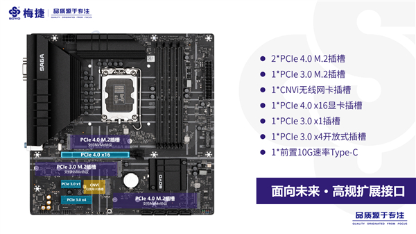 传承B660M延续了梅捷稳定性优化与品质的优点,此次采用10路供电模块,核心供电采用SIC654单颗50A的高规格DrMos,比传统上下桥的稳定性会大幅增强。10路供电严格按照Intel全新IMPV9.1的电源标准,供电更精准,确保CPU长期稳定的性能发挥。