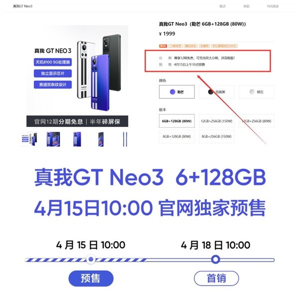 今日消息,realme GT Neo3 6GB+128GB版本将于4月15日在官网独家预售,4月18日上午10点正式发售。这款手机搭载联发科天玑 8100旗舰处理器,采用6.7英寸+FHD+分辨率+120Hz刷新率的OLED柔性直屏。