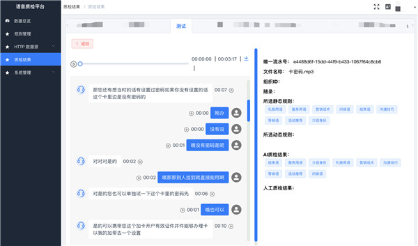 智能语音质检平台,基于自研ASR和NLP技术,面向呼叫中心提供话务质量检测的产品,可帮助用户解决人工质检效率低、无法全量质检等痛点问题。该平台可根据业务场景配置质检规则(如关键词、话术、情绪、静音时长等及其组合),可视化显示客服人员的服务质量。