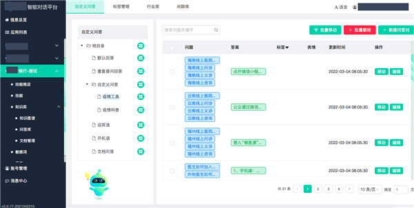 智能对话平台,融合NLP和知识图谱等技术,实现任务型对话和知识型对话等,支持对话知识库配置、对话流程控制等功能,支持钉钉、微信、APP、网站等多种接入通道,广泛适用于智能客服问答、智能办公助理、售前业务咨询等在线/电话客服系统。