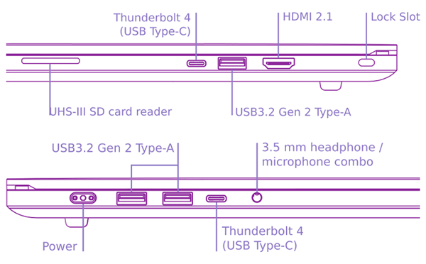 存储部分为 64GB DDR4 RAM + 2TB SSD 的组合,纤薄的 4.4 磅铝制一体机身在侧边提供了雷雳 4、USB 3.2、HDMI 2.1 端口,在内嵌了一枚 1080p 网络摄像头。