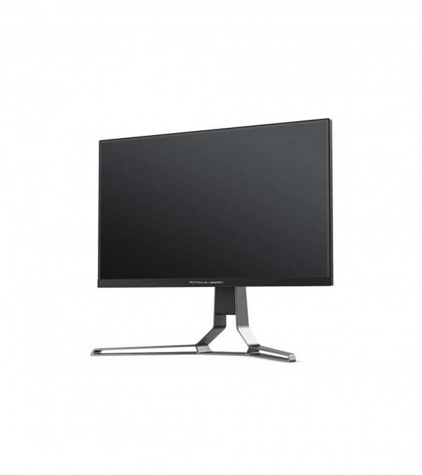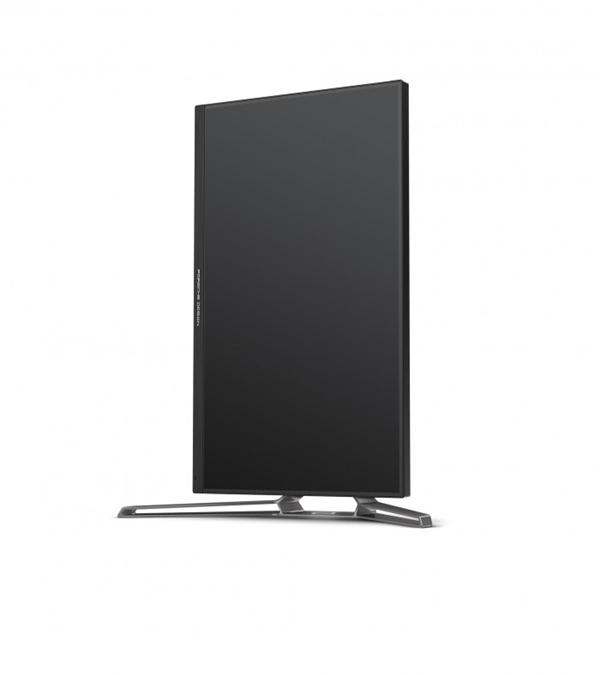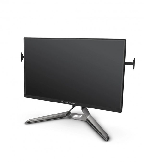 支架方面,这款游戏显示器的占地空间比较大,但换来的是便捷的高度 / 旋转调节体验。为彰显身份,底座上还有一个可点亮的 Porsche Design 标志。